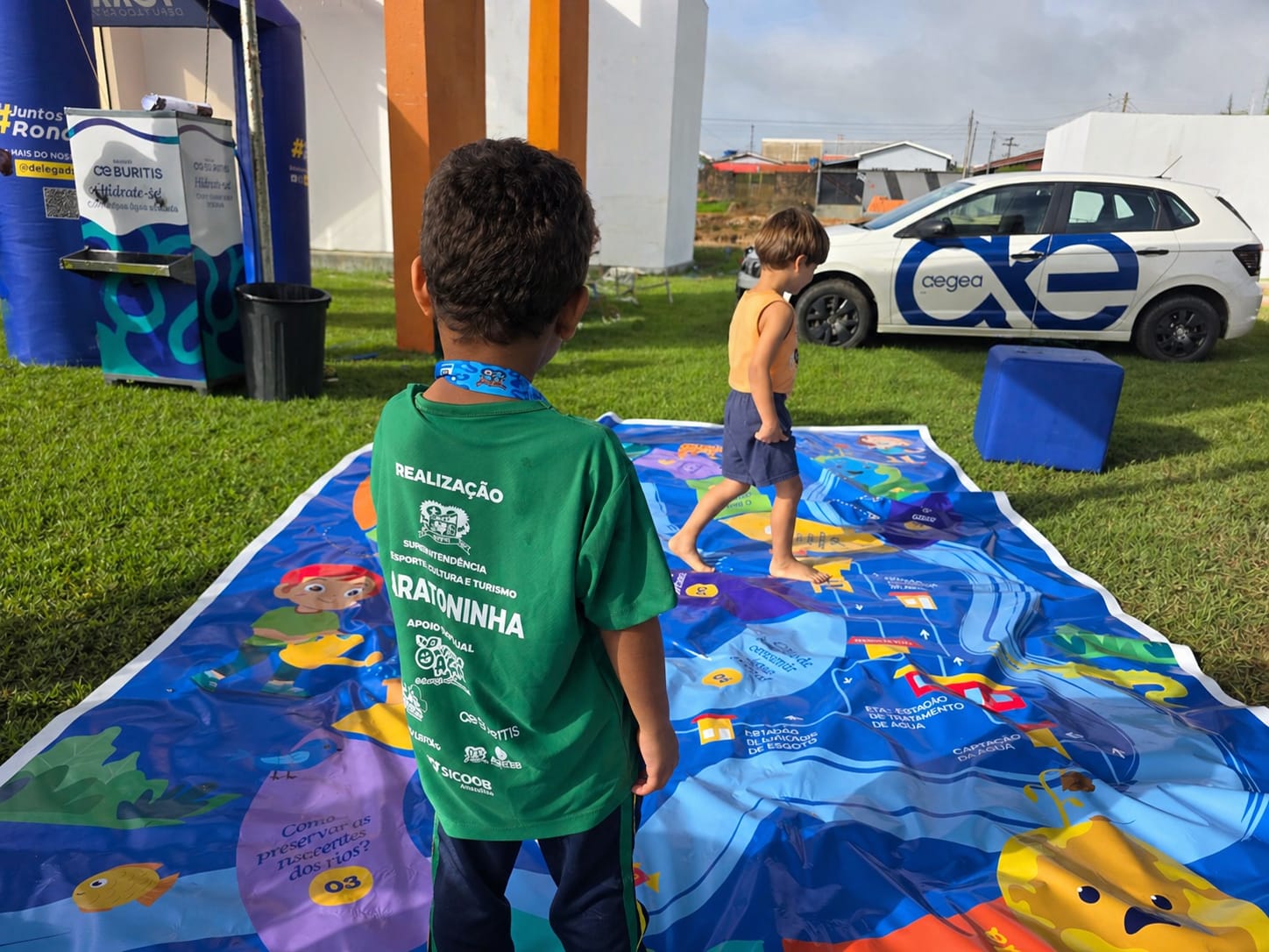 Além da hidratação, a Águas de Buritis levou entretenimento e educação ambiental para as crianças com um tapete interativo. A atividade ensina, de forma lúdica, sobre o uso consciente e a preservação dos recursos hídricos, preparando as futuras gerações para uma relação sustentável com o meio ambiente.